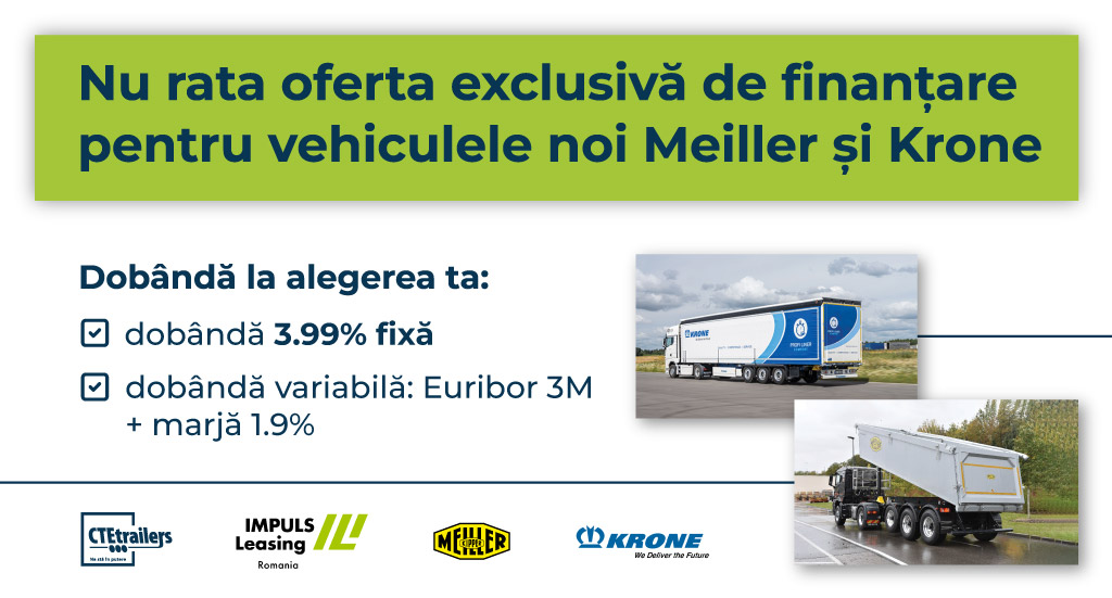 Da. La CTE Trailers ai posibilitatea de a achiziționa semiremorci, trailere, remorci, macarale și suprastructuri basculabile atât în rate, cât și în leasing. Oferim soluții de finanțare de la parteneri de încredere: Impuls Leasing, Raiffeisen leasing, BCR Leasing, BT Leasing, UniCredit Leasing, Deutsche Leasing, Garanti Leasing și OTP Leasing. În plus, echipa noastră este aici pentru a-ți oferi consultanță în alegerea celei mai bune variante pe termen lung.